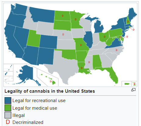 This is one of those positions that I’m playing back and forth in my mind. On one hand, there is a lot to like about cannabis. First, there is a Wild West mentality in the cannabis sector where we have lots of players and don’t know who is going to end up on top. IF (a very big if), things break right, we have potential for stocks to go up by 5X-10X over the next 10 years. For that to happen, cannabis needs to be legalized (a big question mark, but trending in the right direction) at the federal level. What we have now “works” in that cannabis is legal in certain states (18 states plus the District of Columbia) for recreational use and even more states (36 states plus the District of Columbia) for legal use with medical prescription. On a geographic basis, it is mostly legal along the West coast and in the Northeast.