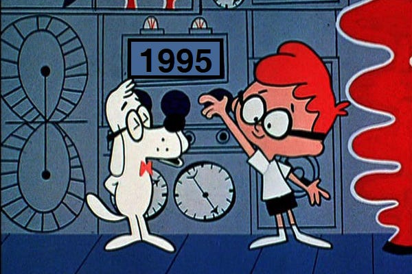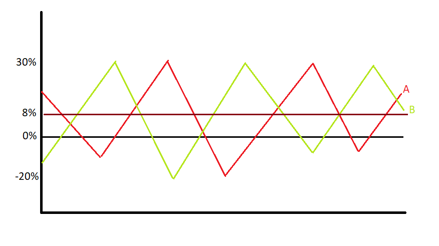 Yep, 1995…even a bit further. Anyway, my thought on this graph was “So, buy Stock B initially as it climbs, then sell it and buy Stock A once B hits it’s peak, then sell it and buy Stock B…” (without even realizing that buying Stock B initially means you are underperforming for the first few months as Stock A is actually earning a higher return). However, the real key is that if you assume markets are reasonably efficient (not perfect, but close) then you really don’t know which stock is going to go up or down going forward. If instead, you buy them both and the upswings/downswings cancel each other out. Again, this is an exaggerated example as you aren’t going to find stocks that move in perfectly opposite directions, but the idea is that you are illustrating the concept of diversification. My original idea had an amateur mistake in assuming we could KNOW which stock was going up and which was going down. After hearing the explanation and spending more time with it, the mistake was cleared up. Learning was done and I improved. Kind of handy a few years later when I found myself trying to explain these concepts to students!